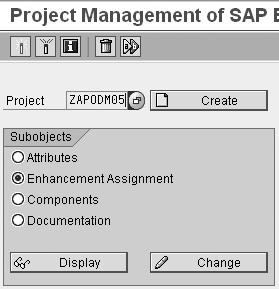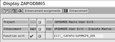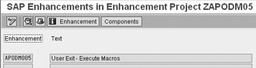 Most experienced ABAP programmers know that you need to create a project the first time you use a user exit. Use transaction code CMOD to create the demo project ZAPMOD05 (Figure 7). Under this project, select Enhancement Assignment and click on the Display button to view the screen in Figure 8. In this screen you can see the standard SAP user exit APODM005, which you use to write user exit code for the macro.