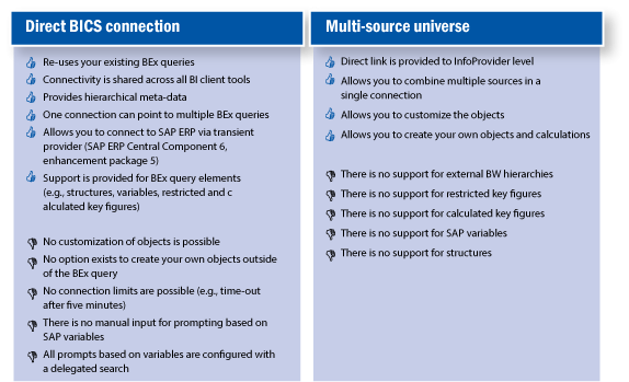 On the other hand, direct connectivity does not provide you with a semantic layer artifact like the universe. That means that you are unable to create any custom objects, and that you are unable to change descriptions or definitions of objects. Basically, your BEx query must contain all the necessary information that you need to fulfill your reporting requirements.