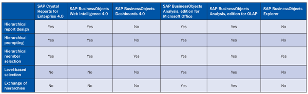 In Table 1, you can see if the SAP BusinessObjects BI client products are able to provide the described capabilities in regards to hierarchies as part of the SAP BusinessObjects BI 4.x release. You might wonder how SAP BusinessObjects Dashboards is able to provide a hierarchical member selection without providing a hierarchical report design. SAP BusinessObjects Dashboards is able to read hierarchical data, but the 4.0 suite release does not provide any hierarchical data visualizations.