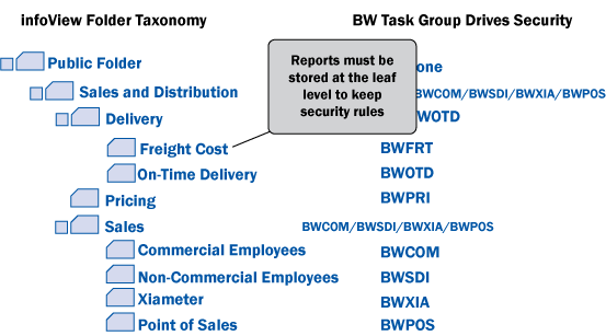 “SAP Business Warehouse is a good engine for us, so when we implemented our BusinessObjects foundation, we tied it into our BW foundation — not just for the data but for how we manage security, how we manage folder structures, how we manage authorization and who has what capabilities,” Duly explains (Figure 2). “Those are all done through BW in security task groups, so we tied those two environments together.”