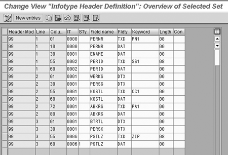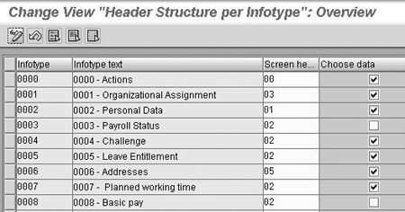 In Personnel Administration (PA) screens, the first three lines at the top of the screen hold the infotype header. Headers are configurable and allow you to control not only the fields that are displayed, but also the physical layout and sequence of those fields. Since Release 4.5A, nearly any infotype field in the standard system, as well as any customer-defined fields stored in infotype structures, can be used as output.