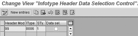 In step 1, you configured infotype 0006 to display data based on the record begin date. For your configuration now in table T588H (see Figure 4), you want any header data in header modifier 99 that is based on infotype 0006, subtype 1, to be displayed by the system date. Indicate this in your configuration by leaving the data selection field unchecked for the infotype 0006, subtype 1, combination. This configuration allows you to display the ZIP code field based on the system date, and the remainder of the header fields based on the record effective date. This way, the current ZIP code is always displayed in the header.