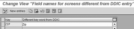 Step 6. Create your own key fields or long texts. Finally, this optional configuration step allows you to create field names in table T588L that are different from the ones in the DDIC entry in displaying your headers. Keywords are only applicable for field types TXT and TXD. Custom key fields are restricted to just field types TXT and TXD because these two types refer to the field name from the ABAP Dictionary. It would not make sense to apply custom key fields to field types that only output data values such as DTX. In your configuration (Figure 5), you create a keyword called ZIP that displays a value of Zip when used in a header.