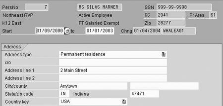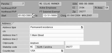 Now, let’s see the configuration in action. Figures 6 and 7 show two infotype 0006 headers for the same employee for two different effective dates. Notice the header placement of the ZIP code field you configured earlier. In these two screen headers, the organizational assignment data in the header changes based on the begin date of the record. But, in both cases, the ZIP code is displayed based on the system date, even though the ZIP code in the master data for that employee changed over time. This is a good example of a header that contains data effective from both the system date and the record begin date.