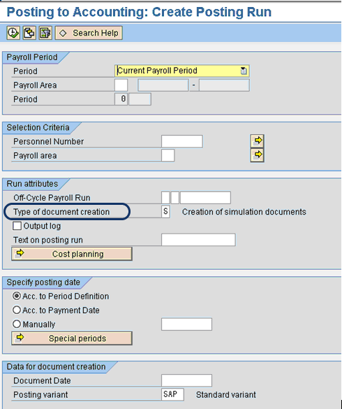 You can execute posting runs via program RPCIPE00 or by following menu path Human Resources > Payroll > Subsequent activities > Per payroll period > Posting to Accounting > Execute posting run (Figure 1). You can execute three types of posting runs in the system: a test run, a simulation run, and a productive run. You can simulate a posting run by creating a test run without posting documents and by creating a simulation run with posting documents. The type of posting run performed is controlled by the Type of document creation field in Figure 1. To execute a production run, enter P in the Type of document creation field. Alternatively, to execute a simulation run (with documents) enter S or to execute a test run (without documents), enter T.