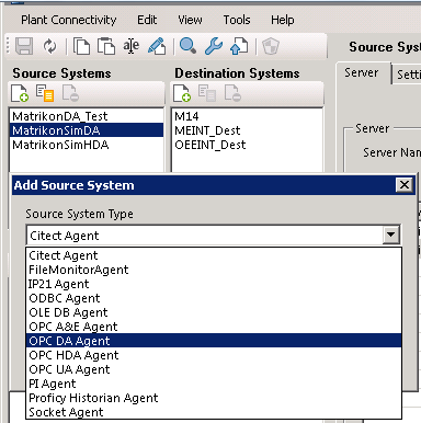 Settings configuration for OPC DA source system