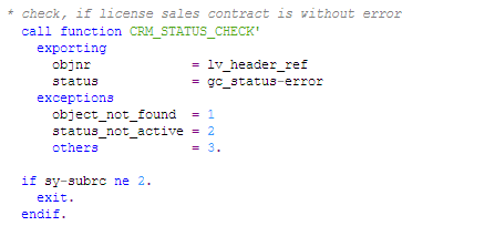 First, perform a modification by commenting out the function call CRM_STATUS_CHECK in the CRM_COPY_CHECK_H_OW function module (Figure 9).