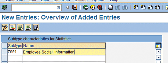 Enter the new subtype value (Z001) in the Subtype column and Employee Social Information in the Name column. Click the save icon to save your new statistics subtype.