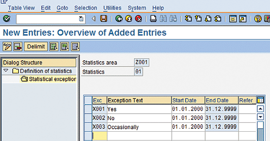 New entries screen for statistical exceptions