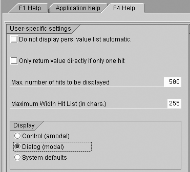 If you don’t see the letter code (hot key) next to the elementary search help, this is due to your search settings. To change them, follow this menu path, Help>Settings>F4 Help (tab) and choose Dialog (modal) (radio button) from any SAP screen. See Figure 3. Your system may be set up with a different value for consistent display of help features to users, so investigate the reason for the current setting in your system before making this change for all users.