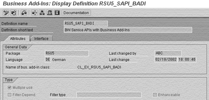 Note that the Multiple use box is checked, which means it could have several active implementations. The Filter-Dependbox is not checked, which makes sense because this is a general purpose BAdI. It is not country or IS specific. Click on the Interface tab and you see the screen shown in Figure 2.