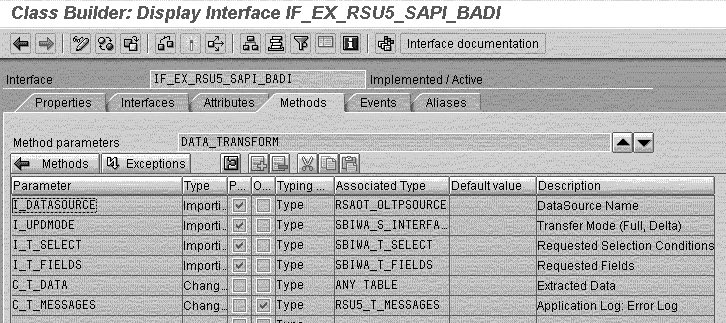 You can see the two currently active implementations: FC_CRM_BUAG_BW and GMBW_IMP_RSU5_SAPI. (Now that you know the names of the active implementations, you can simply run transaction SE19 and type in the name of the implementation.) Double-click on the name of either of the implementations and you are taken to the display screen of this implementation. If you are in the Interface tab of this implementation, you see the names of the two methods of this BAdI (DATA_TRANSFORM and HIER_TRANSFORM). Double-click on the DATA_TRANSFORMmethod to go to the code for this method.