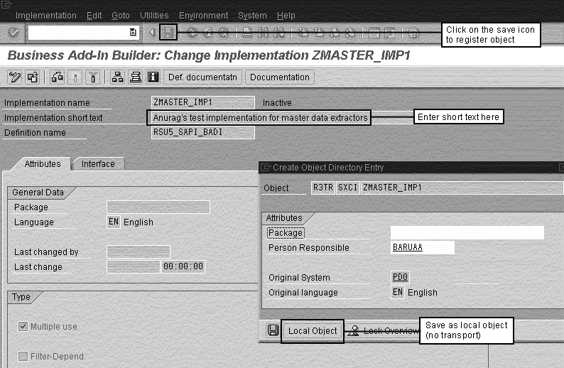 Give your implementation a meaningful (technical) name. I named it ZMASTER_IMP1 because I plan to put all enhancements to standard master data DataSources in this implementation (Figure 7). You should give it a name that describes the implementation in some measure. Press Enter to go to the next screen where you enter a short text for your implementation. I will call it Anurag's test implementation for master data extractors. Use meaningful text.