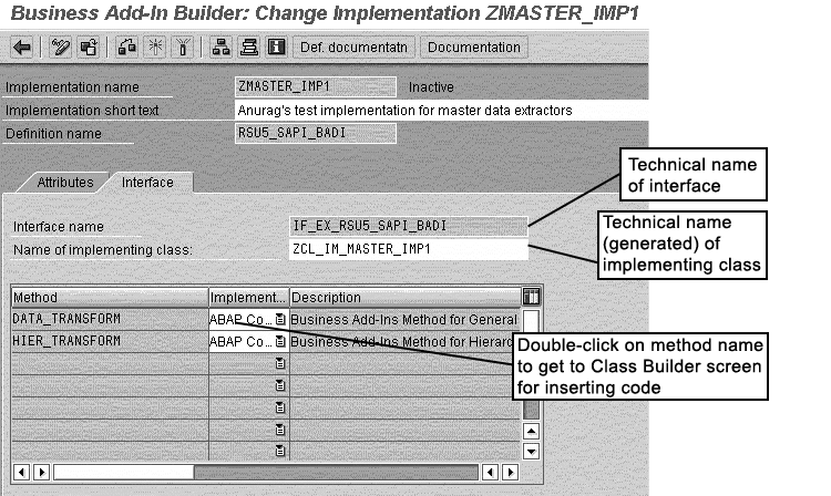 Since BAdIs are based on an OO paradigm (and implemented using OO ABAP), the system provides an interface (technical name IF_EX_RSU5_SAPI_BADI). This serves as the framework that you use to implement your enhancement logic. The other OO-related piece is the technical name of the generated class (ZCL_IM_MASTER_IMP1). This is the class that the system generates when you save your implementation. It is this class that implements the interface IF_EX_RSU5_SAPI_BADI, which means that it automatically inherits the method (or stub). If you are curious, double-click on the name of this class to go to Class Builder where you can find all the information about your class.