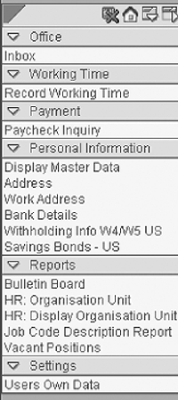 Our next step was to determine which transactions each country would require in ESS. Categories are used to classify the transactions for readability purposes. Within the categories, R/3 transactions are presented to ESS users as options on the ESS navigation menu. SAP refers to these options as “services,” and the menu can offer different services based on the country of the user.