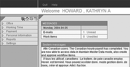 The start page for the ESS stand-alone solution displays how many unread items are in the user’s SAP inbox. If you did not set up the inbox functionality as a service, then the user could not link to it from the PZM3_Start page (Figure 10). The only way that the user could branch from the PZM3_Start page to the ESS inbox template (transaction BWSP) is if the inbox transaction is defined as a service on the PZM3 ESS menu. ESS start page with email