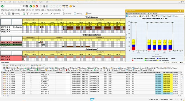 LMPC Screen Shot: Enhancement of the graphical planning table with the tabular planning table below and the chart viewer on the right.