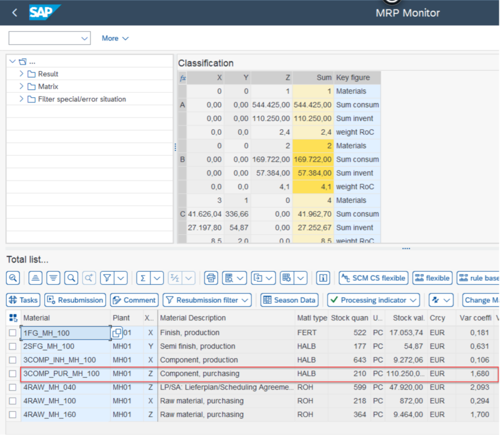 Next, transaction/SAPLOM/MRP is used to perform a classification according to the consumption fluctuation (XYZ analysis, see unit 3, "Material Classification/Material Segmentation"). The result can be seen in picture.