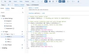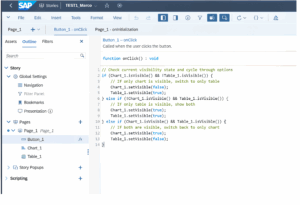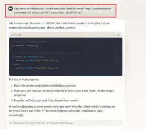 Claude generated two separate output sections as shown in Figure 7, and correctly identifying that SAP SAC Script requires an Initialization Script. Following its recommendation, we copied the first code block into the Page Initialization Event. In addition, as shown in Figure 8, Claude code has been updated in the Button_1 Onclick event, and SUCCESS! What’s truly impressive is that Claude independently created distinct names for the different button states: Show Table Only, Show Both Views, and Show Chart Only. I never explicitly requested these names, yet Claude proactively assigned them and updated the button accordingly in the recommended code generated.Â