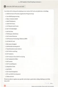 Step 1: We need to verify whether Anthropic Claude can perform this task. Clearly, this tool wouldn’t be mentioned here if it couldn’t—but for the sake of fairness, we must evaluate it alongside the others. As shown in Figure 1, Anthropic Claude confidently states that it can support SAP SAC scripting. Figure 2 further illustrates the wide range of SAP tools it claims to code—allegedly, quite a lot!Â