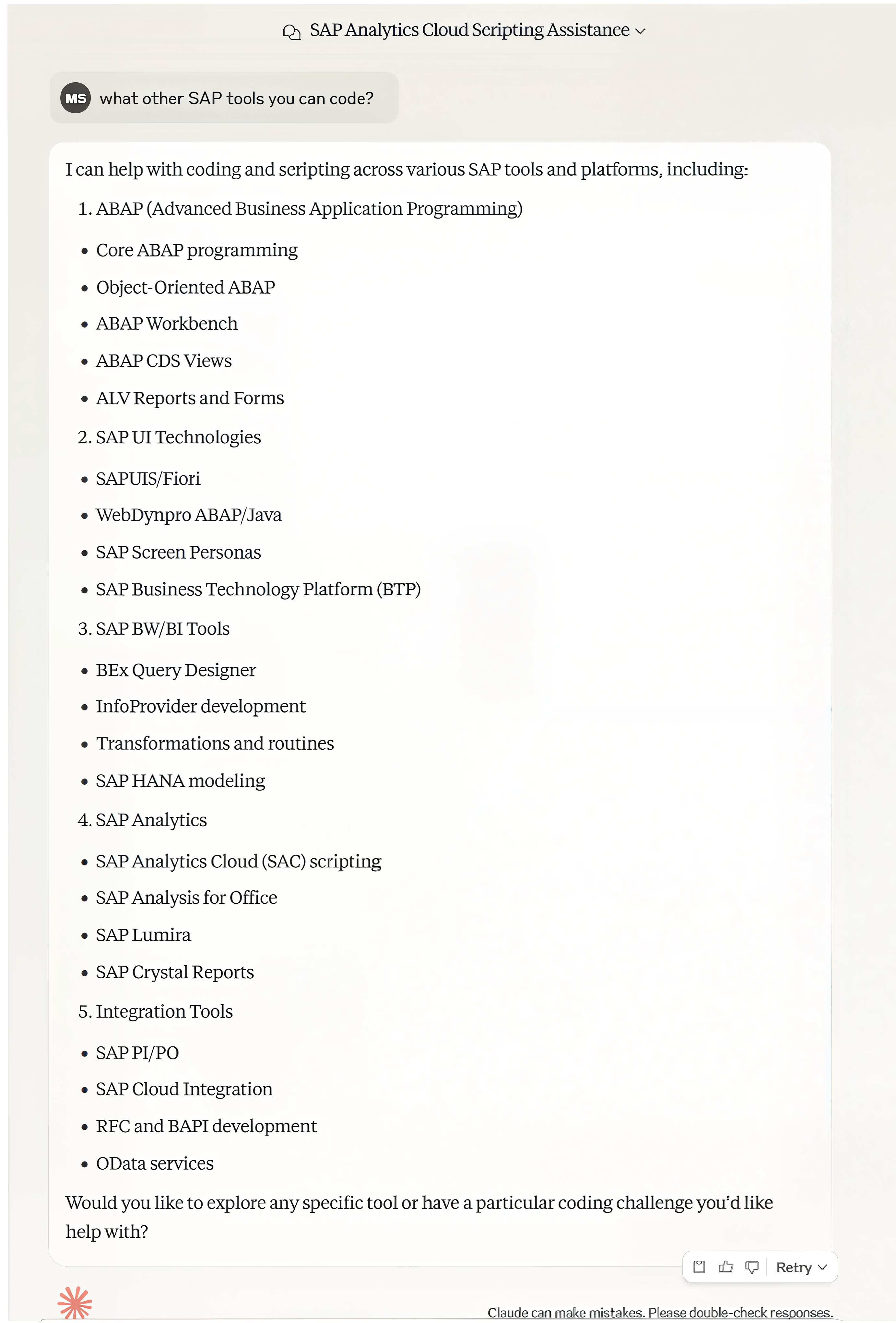 Figure 2. Anthropic Claude confirms it can code in a lot of SAP tools! Like a lot!Â