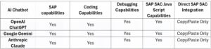 Claude delivered! It resolved the code issues with the fewest attempts, requiring just four prompts to fine-tune the initialization code, while the main code worked on the first try using the same inputs that ChatGPT and Google Gemini had. In comparison, ChatGPT needed 10 attempts to get it right, and required human intervention to correct the main code with a new statement and Google Gemini never provided a working solution on the main code. Additionally, Google Gemini’s recommended code was by far the most complex among the three AI chatbots tested for SAP SAC JavaScript. Claude wins by knock out!Â