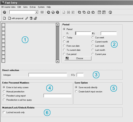 If you go to the fast entry main screen, you see various options. First, your company may or may not have configured infotypes into the fast entry infotypes menu. (See Figure 1, reference 1.) Infotypes do not have to be listed in the menu to use the fast entry functionality. If your company wants to create entries in the fast entry infotypes menu, a member of your configuration team can go into the IMG via menu path Personnel Management > Personnel Administration > Customizing Procedures > Infotype Menus to complete the necessary configuration entries.