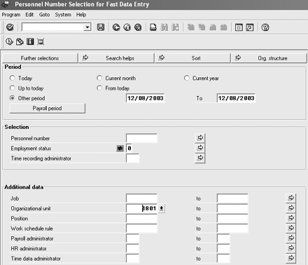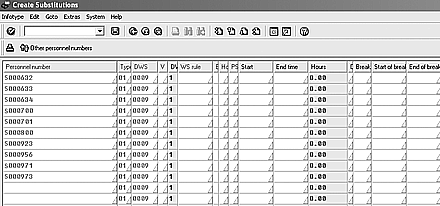 - The manager could use fast entry (transaction PA70) and select all his hourly employees at one time to create all 10 second-shift, eight-hour substitution (infotype 2003) records.