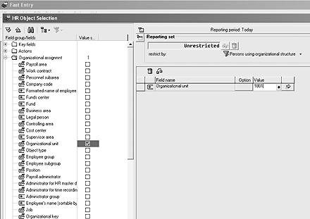 - Preselect using report: A report selection screen helps filter the data for the individual whose records you are creating (Figure 4). A member of the technical team would have to create a preselection report if you do not want to use the R/3 standard report RPLFST01. If a member of your technical team creates a custom preselection report, he or she needs to register it in T588Q (screen types for fast entry table) as well as the T588R (selection reports for fast data entry table). The benefit of using a preselection report is that the user can pull up multiple individuals based on specific master data characteristics. Let’s go back to my example. The manager wants to pull up his 10 hourly employees. If he has a preselection report, he can select his organization on the preselection screen. This allows him to pull up his 10 employees’ personnel numbers without having to key them in manually.