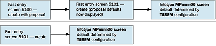 The infotype MPnnnn00 default is determined by T588M configuration (Figure 6). Individuals using the fast entry screen or the create with proposal screen need to be aware that fast entry functionality differs from the maintain master data functionality. If you use transaction PA30, the substitution infotype 2003 screen may differ from the screen someone else sees. In the US, a company might use every field on infotype 2003. However, in Canada, the same company might not use every field. Therefore, a member of the technical configuration group would set up values on table T588M indicating that users in Canada would see only the clock-in and clock- out times, whereas individuals in the US would see every field on infotype 2003. PA30 can process the two T588M records correctly. The fast entry transaction PA70 cannot process multiple T588M records. Instead, fast entry functionality only reads the first T588M record. Therefore, Canada and the US users would see the same infotype 2003 screen for the main fast entry screen even through they see different infotype 2003 screens through transaction PA30.