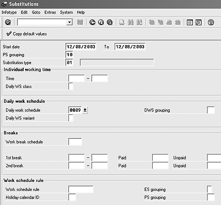 In my example, the manager wants to create a substitution for 10 employees that would result in a second shift, eight-hour day on December 8, 2003. Say that he has decided to use the create with proposals functionality. He selects infotype 2003 from the direct infotype selection field on the main fast entry screen. In the Enter Personnel Numbers section, he leaves the default radio button set to Enter in fast entry screen. He enters December 8, 2003, in the Period Fr. field. He leaves all other screen default values as they were and selects the create with proposal icon. The infotype 2003 substitution screen 5100 displays. He keys in the PS (personnel subgroup) Grouping field value for the employees and the Substitution type. He keys in Daily work schedule 0009, which is the second shift, eight-hour day (Figure 7). The final step is to click on the copy default values icon.