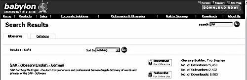 - Search for interesting glossaries and dictionaries that other people have created (for examples, see Figure 3), and download those (for free) to your computer so that you do not need to be connected to the Internet to view them. For example, by using the search keyword "SAP," I found a dictionary there that will translate many SAP FI/CO words (such as "Settlement") from English into German (so that I can know what English-speaking FI/CO consultants are talking to me about!).