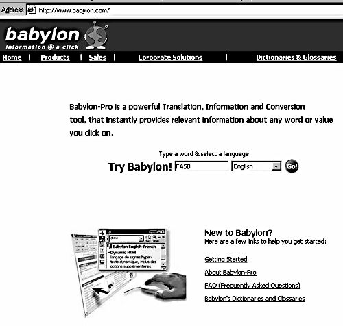 This article evaluates the online and offline features of "www.babylon.com," a useful translation, information, and conversion tool that allows you to type in a word, phrase, or acronym, and launch a search for definitions, facts, and translations into foreign languages ... without actually being connected to the Internet at the time. After a review of the site and its free viewing program and dictionary/glossary downloads, there are three demonstration exercises that give you a chance to try the tool out for yourself.