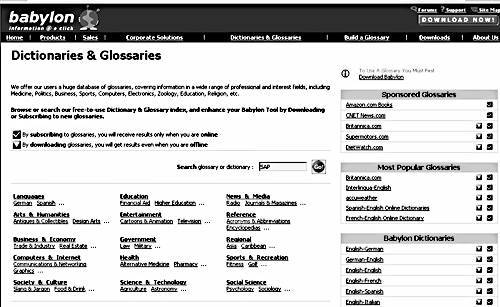 The URL is www.babylon.com. Once you get there, you will see in the lower corner of the main window the words "Dictionaries & Glossaries." For a search keyword, you can try "SAP" and the click on the "Go" button.
