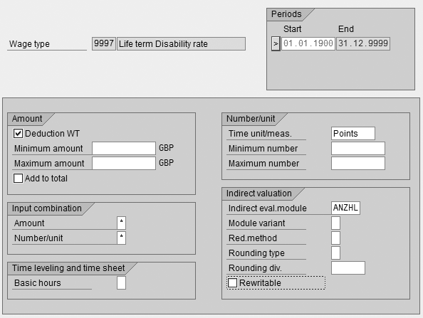 Many payroll implementations include a requirement at the blueprint phase to default the amounts, values, and percentages using numbers or points. One such requirement is to capture 1.203,00 points as the disability insurance rate in wage type 9997.