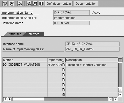 Step 2. Activate the BAdI. Activate the BAdI in the implementation guide by following menu path SPRO>Personnel Management>Personnel Administration>Payroll Data>Indirect Valuation>BAdI: Maintain Indirect Valuation Module (Figure 4). Click on the create icon to create the BAdI with a customer-specific name. Name the BAdI starting with Z. I used the name ZHR_INDVAL. Next, enter the implementation short text with your naming logic (for example, ZHR_INDVAL). Define the filter as ANZHL. By defining this filter to ANZHL, you are activating the BAdI only for this indirect valuation module. Click on the green check mark (enter) icon.