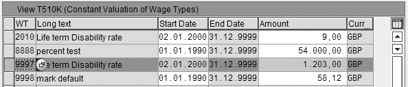 If the values for the same wage type change, then you can delimit the previous entry and enter the new values for the same wage types with new dates. This might happen if the insurance provider changes the base value from 10 (which applies from 01/01/1990 to 01/01/2000) to 1.203,00 (which applies from 01/01/2000). For example, Figure 9 shows two values for wage type 9997 for these different dates. The user exit always defaults the values with end date 31/12/9999.