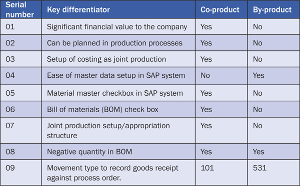 Table 1 shows some of the key differentiators between a co-product and a by-product to help you decide how to treat these additional products in your SAP system.