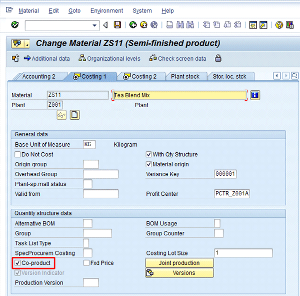 Then select the Organizational levels button. Select the organizational level – that is, Plant. In my example, I use Plant Z001. After entering Z001, press Enter or click the enter icon. This leads to Figure 1, which is the costing view of the material master. In Figure 1, select the Co-product check box to declare that the material is a co-product.