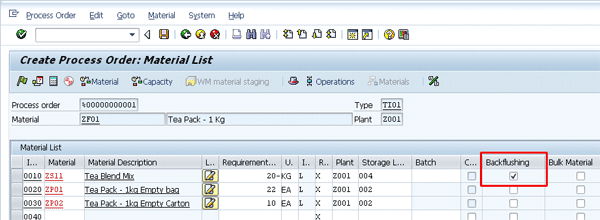Goods movement of process order with backflush functionality