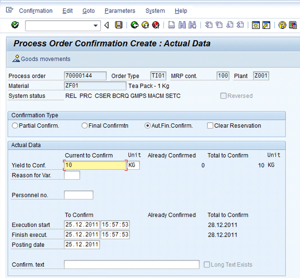 Figure 13 is the process order confirmation screen in which you enter the quantity of goods produced. In my example, I entered a quantity of 10 to show that yield or production quantity against the process order was 10 units. Save the confirmation by pressing Ctrl+S or clicking the save icon.
