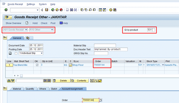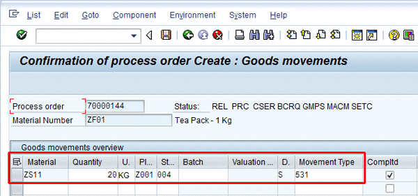 It is due to backflush functionality that the goods movement (goods issuance at this stage) is made possible. When confirmation of a process order is being done, goods issuance (through backflushing) is also simultaneously done. Since this is a by-product with mvmt. Type 531, I am declaring that 20Kg of material ZS11 was produced as by-product during the actual confirmation process of main material ZF01.