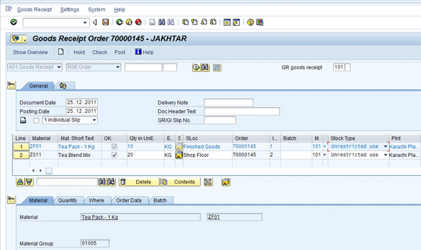 Figure 15 is the screen in which the goods receipt against the process order is undertaken. Enter the process order number and save by pressing Ctrl+S or clicking the save icon.