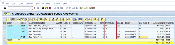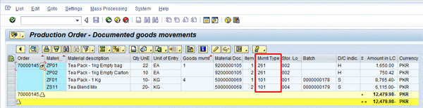 Figure 17 provides the list of quantities as well as the amount of goods receipt and goods issuance against a process order. The relevant movement types are also shown as well as whether it is a debit entry (S) or a credit entry (H).