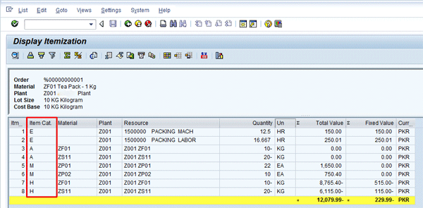 Planned cost of process order – itemized view
