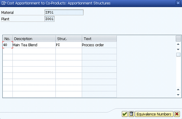 In Figure 2, I entered 40 percent as the equivalence number (in the first column), followed by a short description. Next select the apportion structure as PI, which is for a process order. This means that 40 percent of the total cost of production of material ZF01 will be allocated to the material ZS11.