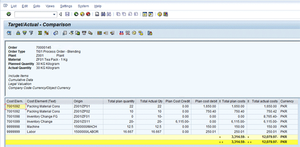 Figure 20 is the plan versus actual comparison of financial values against a process order. On the display process order screen, follow menu path Goto > Costs > Analysis (Figure 20).