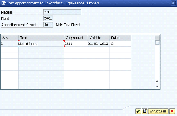 Next keep the mouse in the first row of Figure 2 and click the Equivalence Numbers button to get to Figure 3. Figure 3 requires details of the assignment of the apportion structure – that is, the cost of the finished good (ZF01) that will be allocated to the co-product (ZS11). In my example it is 40 percent. Click the continue iconÂ