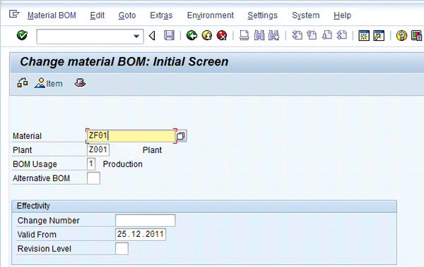 Figure 4 is the change screen for the BOM. To get to the screen follow menu path Logistics > Production > Master Data > Bill of Material > Bill of Material > Material BOM > Change, or use transaction code CS02. Enter the product’s material code — ZF01 in this example — of the main co-product together with the plant and BOM usage (1 for production). Click the Item button in Figure 4 to get to the screen shown in Figure 5. You could also press Enter to go to Figure 5.