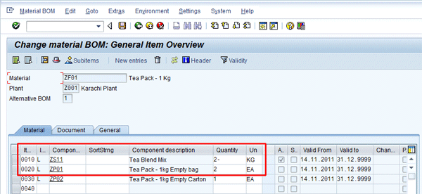 Figure 5 is the item overview of BOM. Here the negative quantity is entered for material ZS11, which is a co-product. Other components such as ZP01 and ZP01 are defined in positive quantities and are consumed during production.